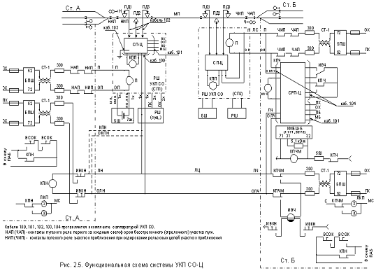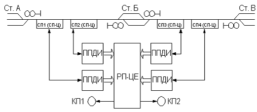 2. Счет осей подвижного состава производится в счетных устройствах СП-Ц, расположенных в релейных шкафах входных светофоров, рядом с которыми располагаются путевые датчики ПД1… ПД3, а в СРП-Ц (станционный решающий прибор, расположенный на ст. Б) передаются результирующие и преобразованные данные. Это позволяет передавать с заданной достоверностью информацию в СРП-Ц и использовать в канале приема и передачи линейные цепи (ЛЦ) практически любых линий связи, включая линии СЦБ, ВЧ каналы.