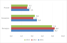 составляла: в 2011 году - 8,2%, в 2012 - 8,4%, в 2013 - 7,9% [23]. У Казахстана