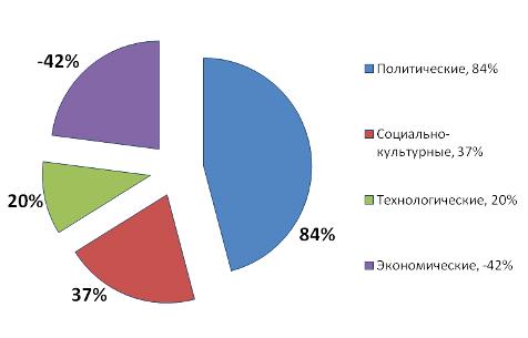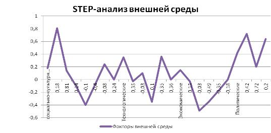 На графике профиля макросреды университета видно, что наибольшее влияние на деятельность организации оказывают социально-культурные (отрицательные) факторы, такие как: нехватка квалифицированных кадров на рынке труда, возможность возникновения демографической «ямы». Из технологических факторов можно отметить - увеличение требований к качеству образования, переходы на новые образовательные стандарты, из политических в положительную сторону - поддержка молодых специалистов со стороны государства, выдача пособий.