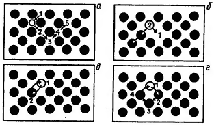 Механизм протекания диффузии может быть межузелъным, вакансионным, обменным и циклическим (рис. 1). Реализация того или иного механизма протекания диффузии определяется кристаллическим строением вещества и типом дефектов его кристаллической решетки. Так, доказано, что основным механизмом диффузии примесных атомов в твердых растворах замещения является вакансионный, а в твердых растворах внедрения - межузельный.
