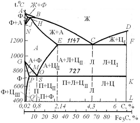 На линии ликвидус начинается кристаллизация из расплава соответственно на участке АВ - феррита (δФ), на участке ВС - аустенита (А) и на участке СD - цементита первичного (ЦI). На линиях АН и JЕ завершается кристаллизация δФ и аустенита из жидкой фазы. Для диаграммы Fe-Fe3C характерны три изотермических превращения: