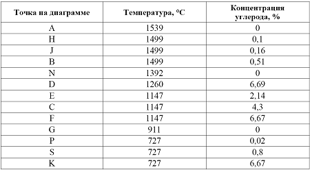 Таблица 1. Характерные точки диаграммы состояния железо-цементит