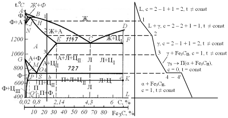 Выше точки 1 сплав находится в жидкой фазе (жидкий расплав углерода и Fe, фаза L), число степеней свободы - С = 2 - 1 + 1 = 2 (температура может изменяться).