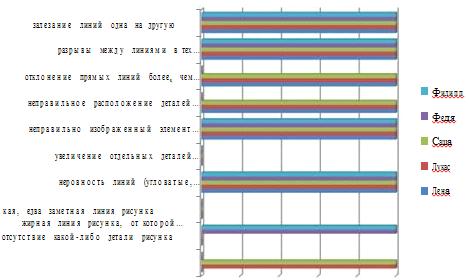 Как видно из представленных в таблице 2 данных, ошибки при воспроизведении образца домика наблюдались у всех школьников. У каждого из испытуемых (5 детей из 5) были отмечены: неровность линий (они были угловатыми, дрожащими), разрывы между ними в тех местах, где они должны быть соединены, залезание одна на другую; они неверно изображали ряд элементов рисунка. Несколько лучше показатель умения передавать правильность расположения частей домика в пространстве. Данный вид ошибок мы наблюдали у 3 детей из 5.