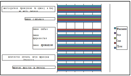Меньше всего встретились такие недочеты, как изображение слабых линий (у 2 из 5). В основном, дети старались регулировать силу нажима - при рисовании прямых «дорожек», она была оптимальной. Но, как только они переходили к волнистым, стал наблюдаться сильный нажим. Что, как нам кажется, связано с усложнением задания, в результате чего, стараясь нарисовать правильно, испытуемые уже не обращали внимание на то, насколько сильно они давят на карандаш.