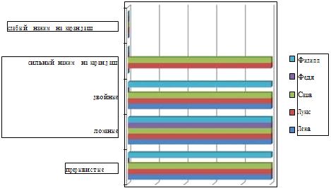 Обобщение полученных данных, а также их анализ осуществлялись нами, исходя из учета условий становления графомоторного навыка, а также составляющих его приемов (необходимых для письма и сами приемы письма), подробно рассмотренных в первой главе данного исследования.