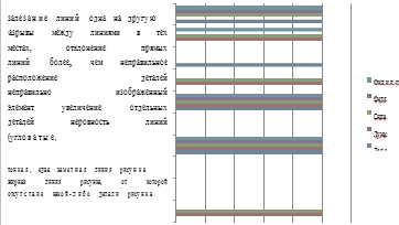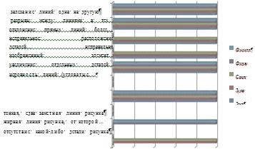 Воспроизводимые прямые горизонтальные и вертикальные, ломанные, волнообразные линии отличались неровностями (угловатые, дрожащие); отмечены отклонение прямых линий от заданного направления, разрывы между ними в тех местах, где они должны быть соединены, залезание линий одна на другую, наличие выходов за пределы контуров при закрашивании, большое количество случаев, когда карандаш отрывался от листа бумаги.