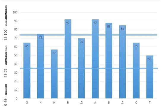 На диаграмме указан уровень самооценки детей 2 Б класса. Горизонтальными линиями обозначен уровень «средней» и «высокой» - адекватной самооценки. По результатам исследования, детей с заниженной самооценкой нет. Пять человек с адекватной самооценкой, пять - с завышенной.