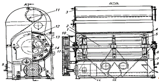 Рисунок 2.1 - Общий вид обоечной машины ЗНМ-5: 1 - наждачный цилиндр; 2 - бичевой барабан; 3 - аспирационно-осадочное устройство; 4 - бич; 5 - чугунная розетка; 6 - отверстие для поступления воздуха в цилиндр; 7 - выпускной патрубок; 8 - люк; 9 - канал для выпуска относов; 10приемный патрубок; 11- аспирационный клапан; 12 - верхний желоб; 13 - жалюзи; 14 - нижний желоб; 15 - электродвигатель; 16 - система клапанов; 17-клиноременная передача