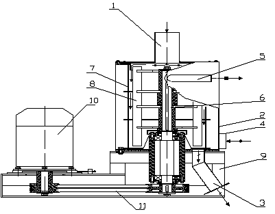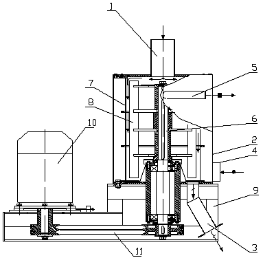 - впускной патрубок; 2 - корпус; 3 - выпускной патрубок; 4 - патрубок забора воздуха; 5 - аспирационный патрубок; 6 - вал; 7 - ситовой цилиндр; 8 - бичевой ротор; 9 - станина; 10 - электродвигатель; 11 - клиноременная передача