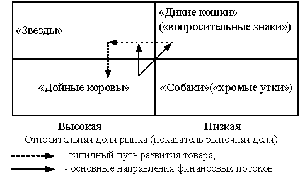 Наконец, в правом нижнем секторе находятся «собаки» (или «хромые утки»). Это товары с ограниченным объемом сбыта (маленькая доля на рынке) в зрелой или сокращающейся отрасли (медленный рост). Несмотря на достаточно длительное присутствие на рынке, им не удалось привлечь к себе достаточное количество потребителей, и они значительно отстают от конкурентов по объемам сбыта. От этих изделий необходимо избавляться как можно быстрее, так как держать на рынке «больной» товар чрезвычайно убыточно. Более того, их присутствие на рынке может нанести ущерб репутации предприятия. Ведь чувство неудовлетворенности покупателей этими товарами может распространиться и на другие изделия фирмы и тем самым подорвать ее авторитет.