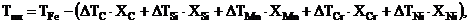 DT - снижение температуры плавления при введении 1 % элемента (DTС =81, DTSi = 9.7, DTMn = 4.9, DTСr = 1.6, DTNi = 3.9);