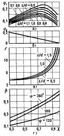Коэффициент расхода смазочного материала q0 на выходе из нагруженной части слоя масла подшипника с цилиндрической расточкой определяют по диаграмме (рис. 5б).