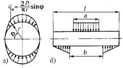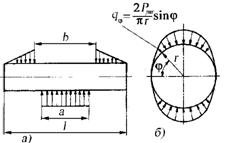 Рис. 15. Расчетные схемы нагружения поршневого пальца от сил инерции Pjпг: а - при расчете на изгиб и срез; б - при расчете на овализацию