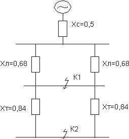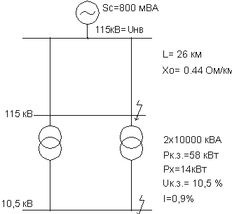 Расчет токов короткого замыкания для точек К1 на напряжение 110 кВ и К2 на напряжение 10 Кв. Принимаем метод относительных единиц. За базисную мощность принимаем Sб = 800 мВ∙А. За базисное напряжение 10 Кв.