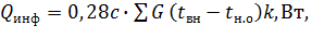 где с - удельная теплоемкость воздуха, равная 1 кДж/(кг×оС);- количество инфильтрующегося воздуха, кг/ч, через ограждающие конструкции помещения;вн, tн.о - расчетные температуры воздуха, оС, соответственно в помещении и наружного воздуха в холодный период года;