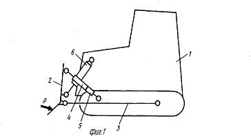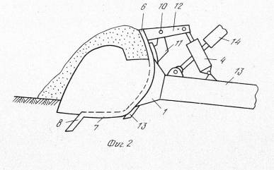 При возрастании сопротивления копания уменьшение толщины стружки, вырезаемой ножом 8, осуществляется гидроцилиндрами 4. При втягивании штоков гидроцилиндров 4, происходит уменьшение толщины стружки, вырезаемой ножом 8.