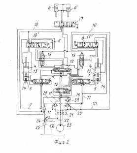 В данном случае проходные каналы крайней левой позиции трехпозиционного гидрораспределителя 12, соединяющие напорную магистраль 16 и сливную магистраль 11 с гидроцилиндрами 6, также блокированы запертыми каналами средней позиции другого гидрораспределителя 12, на гидродатчик 5 которого не действуют экстремальные нагрузки.