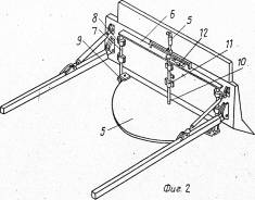 Шарнирное соединение ковша 5 с отвалом 1 выполнено посредством шарниров 10, соединяющих между собой кронштейны 11, закрепленные на тыльной стороне отвала 1, и рычаги 12, жестко связанные одними концами с ковшом 5, а другими с гидроцилиндрами 4 управления. С базовым трактором рабочий орган соединен посредством толкающих брусьев 13 и гидроцилиндров 14.