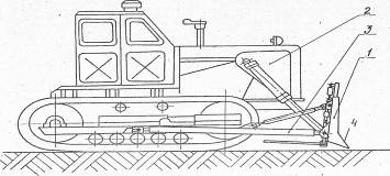 Рабочий орган бульдозера включает отвал I с лобовым листом 2 и режущими ножами 3, гидроцилиндры 4 управления.