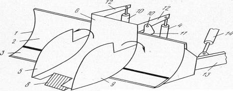 Недостаток известного устройства заключается в том, что поднимаемый средним ножом пласт грунта значительно пригружен призмой волочения, в связи с чем требуются дополнительные затраты тягового усилия, что отрицательно сказывается на производительности. Кроме того, имеют место также потери грунта в боковые валики, что также сказывается на снижении производительности.