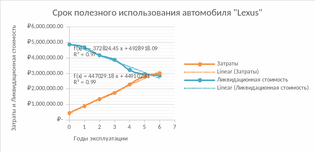 Дальнейшим этапом составляем график ликвидационной стоимости автомобиля и затрат на его эксплуатацию.
