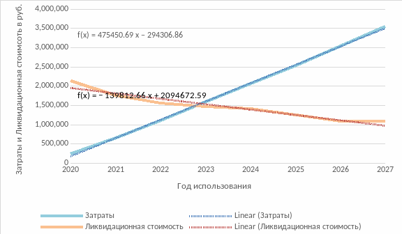 Составим графики затрат и ликвидационной стоимости для определения срока полезного использования автомобиля и проведем ее расчет.