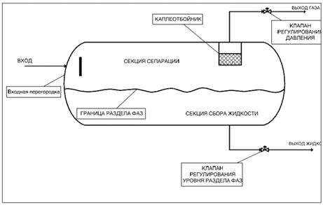 горизонтального двухфазного сепаратора. Поток флюида поступает в емкость