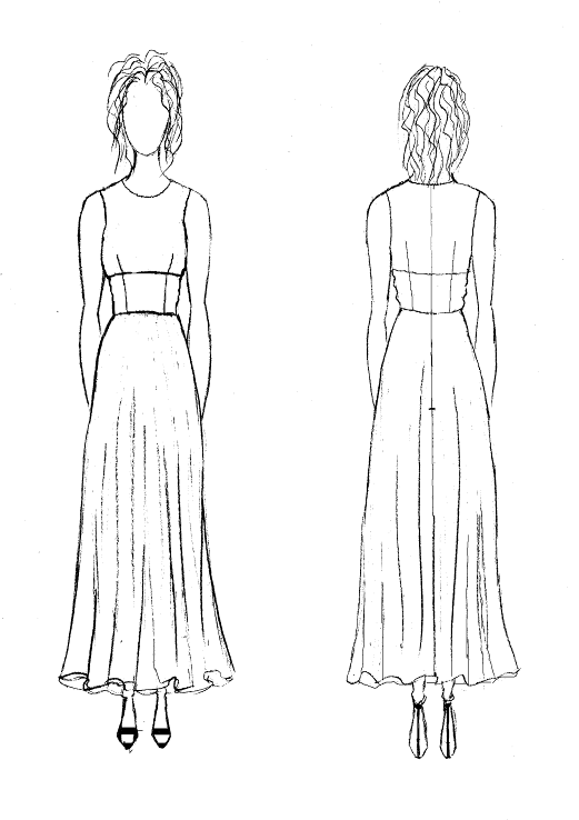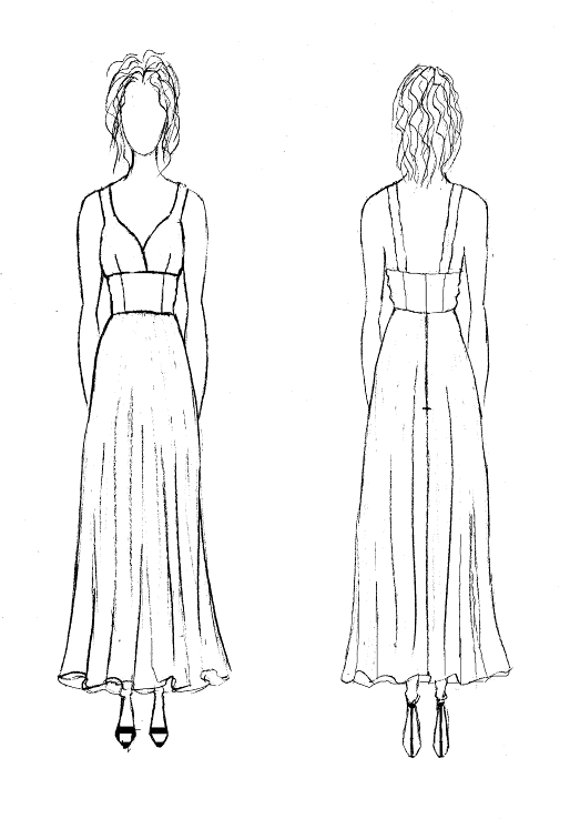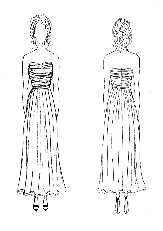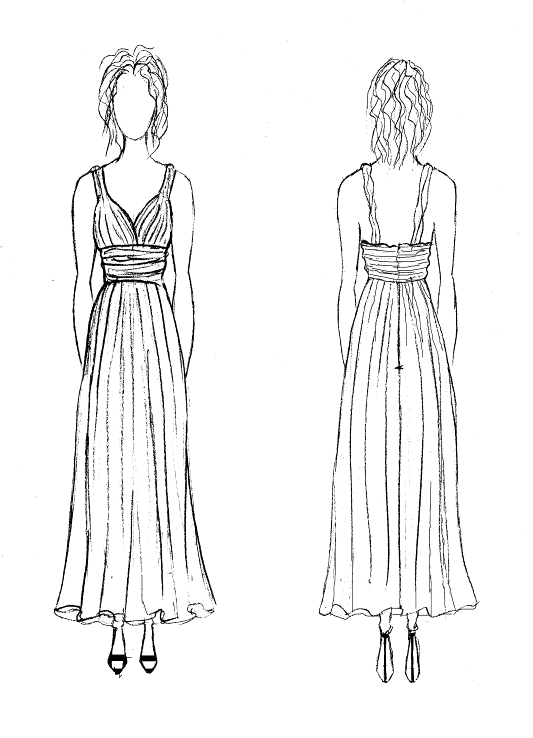 Платье женское, вечернее из ткани органза. Силуэт полуприлегающий, расширенный к низу. Застежка на тесьму-молнию, расположенную в среднем шве спинки. Вырез глубокий до линии груди, V - образный, по верхнему краю - бретели. Платье отрезное по линии талии. Выше линии талии притачивается пояс шириной 15 см. Длина платья по щиколотку.