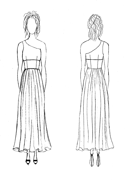 Платье женское, вечернее из ткани органза. Силуэт полуприлегающий, расширенный к низу. Застежка на тесьму-молнию, расположенную в боковом шве спинки. Вырез проходит под углом от линии плеча до линии сопряжения руки с телом. Платье отрезное по линии талии. Выше линии талии притачивается пояс шириной 15 см. Длина платья по щиколотку.