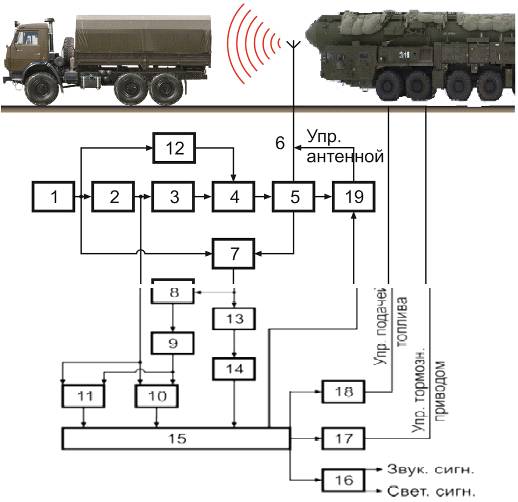 В случае, если водитель не успел среагировать на предупреждающий звуковой и световой сигнал, вырабатываемый схемой 16, что идентифицируется в вычислителе 15 по определяемым величинам текущей дальности до препятствия Rтек, скорости сближения с препятствием vсбл и путевой скорости автомобиля vaм, когда значение этих величин после достижения критических состояний, при которых возможно столкновение как с подвижным, так и неподвижным препятствием по истечении 0,8 секунд (время реакции среднестатистического водителя) не изменяется до безопасного состояния, тогда схема 17 автоматически воздействует на орган управления подачей топлива, переводя автомобиль в режим торможения двигателем, а схема 18 одновременно - на орган управления давлением в тормозном приводе, переводя автомобиль в режим торможения рабочей тормозной системой.