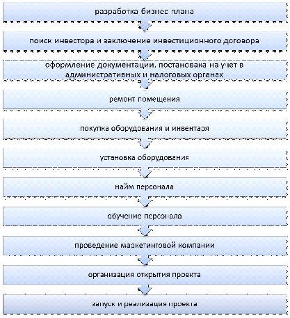 На основе предыдущем этапа, и в зависимости от уровня приоритета каждого из этапов, сформировалась последовательность их выполнения, и их взаимосвязь. После того как был разработан бизнес-план, следует найти инвесторов, для получения финансовых средств и только после получения денежных средств можно реализовывать остальные разделы - оформление документации, ремонт помещения, и т.д.