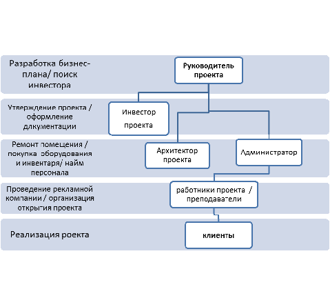 В таблице представлены участие каждого специалиста на этапах реализации проекта. Так, на этапе разработки бизнес - плана принимают участие руководитель организации, как разработчик проекта, и архитектор проекта, который составит план ремонтных работ, затраты на организацию ремонта и реконструкцию помещения.
