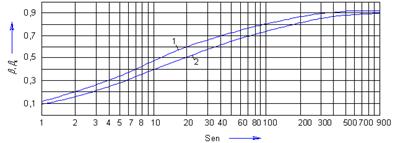 Рис. 2.5 - Кривые зависимости безразмерных коэффициентов β и βк от числа Сен-Венана-Илюшина; 1-для труб круглого сечения, 2 - для концентричного
