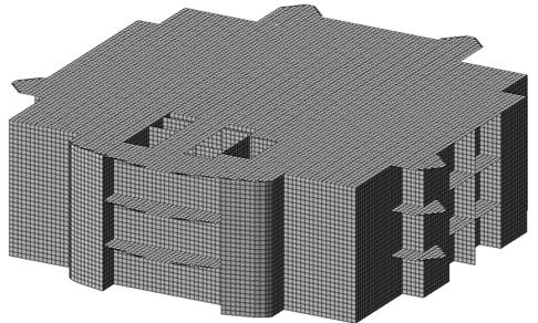 Расчет производится в упругой стадии работы материала. При расчете использовался метод конечных элементов (h-элементы) в форме метода перемещений. Переход от континуальной действительной модели конструкций к дискретной расчетной схеме осуществлен разбиением модели на сетку конечных элементов с шагом не более трех толщин элементов, кол-во степеней свободы у КЭ - шесть (три поворота и три перемещения). Колонны моделировались стержневыми элементами (элементы N10). Плиты и стены моделировались плоскими КЭ (элементы N42 (трехузловые КЭ оболочки) и N44 (четырехузловые КЭ оболочки)).
