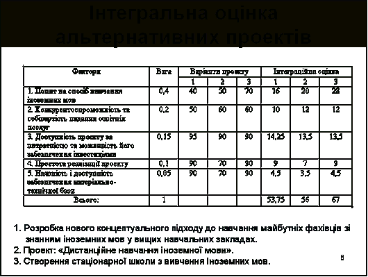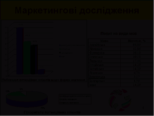 Проект передбачає створення школи з вивчення іноземних мов. Але для формування конкурентоспроможних характеристик необхідно провести маркетинговий аналіз ринку. На сьогоднішній день у м. Дніпро налічується більше 65 курсів іноземних мов.