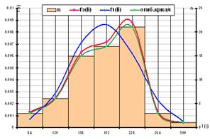 гистограмму: эмпирическую кривую, распределение плотностей вероятностей fэ(li),