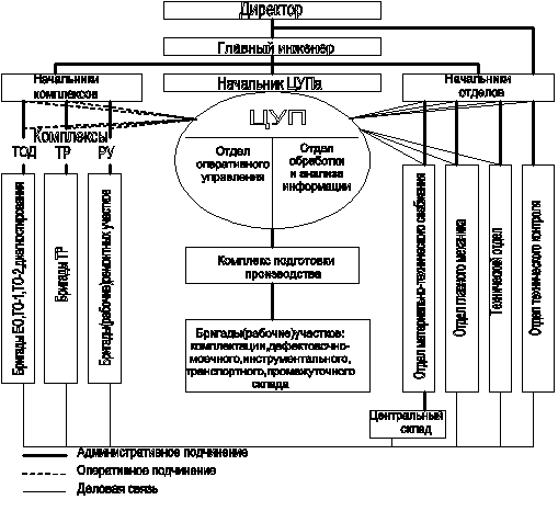 Централизованная система управления производством базируется на технологическом принципе, сущность которого заключается в том, что в основе формирования производственных подразделений АТП лежат законченные технологические процессы технических воздействий на подвижной состав. Управление производством предприятия (ЦУП).
