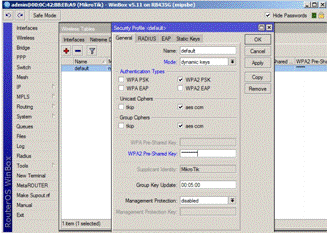 разакликаемпоDefault. Mode: dynamickeys. WPAPSK, WPA2 PSK, tkip, aescom - включаем.