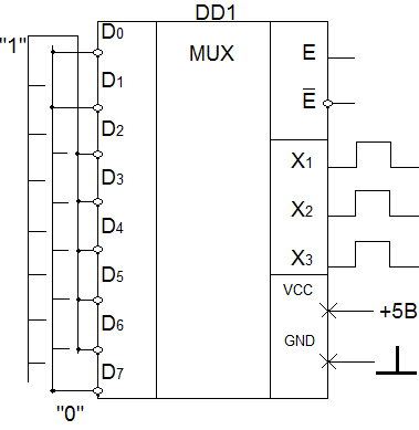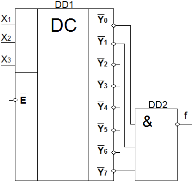 На рисунках 1.2 и 1.3 представлены функциональные схемы реализации заданной логической функции на дешифраторе (рисунок 1.2) и мультиплексоре (рисунок 1.3).