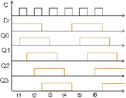 С выхода «Q4» последнего триггера снимается последовательный выходной код. Код на этом выходе регистра появляется с задержкой относительно входного последовательного кода на число периодов тактовых импульсов, равное числу разрядов регистра.