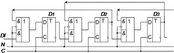 Вход «D» первого триггера служит для приёма в регистр входной информации DI в виде последовательного кода. С каждым тактовым импульсом на этот вход должен подаваться код нового разряда входной информации.
