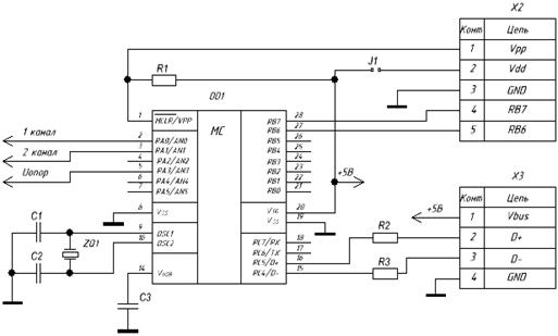 К микроконтроллеру подключены: разъем X2 для внутрисхемного программирования и разъем X3, который будет подключаться к USB порту компьютера, для передачи данных.