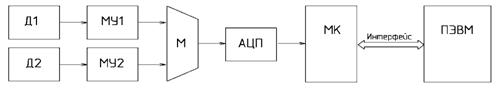 Д1, Д2 - тензо-датчики усилия и деформации; МУ1, МУ2 - масштабирующие усилители; М - мультиплексор; АЦП - аналого-цифровой преобразователь; МК - микроконтроллер.
