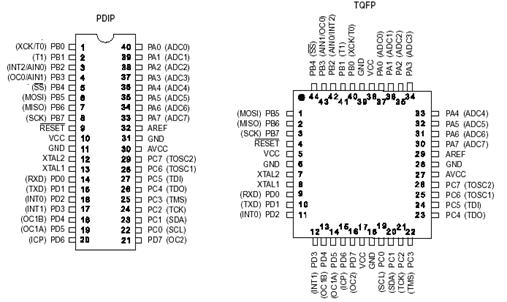 На рисунке 3.1 представлены корпуса МК этого семейства. Как видно из рисунка, фирма Atmel производит корпуса в двух исполнениях: форматы PDIP (40 ножек) и TQFP(44 ножки). Корпус TQFP обладает меньшими габаритами, но контактные ножки могут располагаться только на одной из сторон печатной платы. Для проекта нам подойдет корпус PDIP,так как контактные ножки крепятся одновременно на двух сторонах печатной платы, что очень удобно при монтаже.