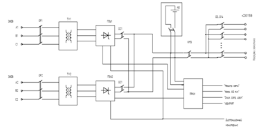 шкаф подзарядного устройства (ПЗУ) полупроводниковый, состоящий из двух управляемых тиристорных выпрямителей (ПЗУ1 и ПЗУ2) с двумя микропроцессорными системами контроля и управления, осуществляющих питание нагрузки выпрямлённым стабилизированным напряжением, заряд и подзаряд аккумуляторных батарей;