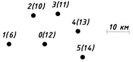 l01=16 км; l02=14 км; l03=15 км; l04=16 км; l05=18 км; l12=17 км; l13=26 км; l14=31 км; l15=33 км; l23=11 км; l24=21 км; l25=29 км; l34=12 км; l35=22 км; l45=12 км.