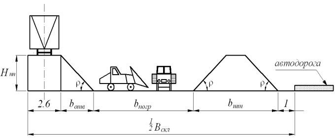 bПОГР – ширина участка между отвалом и штабелем угля для работы ковшовых погрузчиков или бульдозеров при формировании штабелей и погрузке в автомобили, в проекте принимается 16 м.