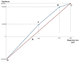 Отрезок, соответствующий услуге В, откладывается следующим по тому же принципу: выручка от его реализации добавляется к величине выручки продукта А на оси абсцисс, а величина вклада - на оси ординат. Координаты точки В - (702 (432 +270) тыс. руб.; 270,046 (112,046 + 158) тыс. руб.). Далее откладываются следующая услуга С. Услуга С (846 (702 + 144) тыс. руб., 302,046 (270,046 + 32)тыс. руб.). Образуется фигура, напоминающая лук с тетивой. Пересечение "тетивы" (отрезка КС) с осью абсцисс, которая соответствует π = 0, даст нам точку безубыточности R.