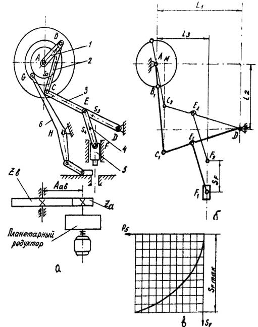Пресс приводится в действие электродвигателем через планетарный редуктор и пару зубчатых колёс с числом зубьев Za, Zb. Колесо Zb насажано на коленчатый вал 1 (рис. 12а ) кривошип которого приводит в действие шарнирно- рычажный механизм прессования. Ползуну 5 сообщается возвратно-поступательное движение, посредством которого происходит прессование. Кулачок пазового типа вращается вместе с кривошипом и через качающуюся вокруг шарнира Н штангу 6 передаёт движение на загрузочную каретку, которая в периоды отхода ползуна 5 вверх загружает порошком пресс-форму. График усилия прессования в зависимости от перемещения ползуна 5 показан на рисунке 12в. Кинематическая схема механизма прессования показана на рисунке 12б.